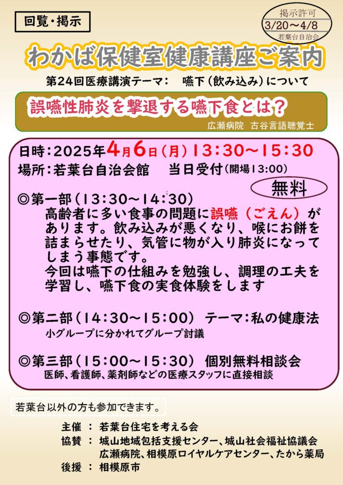 2026-03-31 / 最終更新日 : 2026-03-31 yorii イベント 第24回 わかば保健室 ◊第24回 わかば保健室◊ 2026年4日6日(月)13:30~ (開場 13:00) 場所: 若葉台自治会館ホール