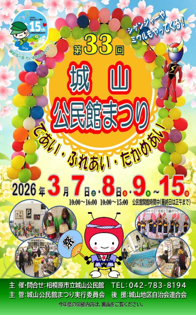 2026-02-28 / 最終更新日 : 2026-02-28 yorii 近隣あれこれ 第33回 城山公民館まつり 2026年3月7日(土)10:00 ~ 16:00 2026年3月8日(日)10:00 ~ 15:00 2026年3月9日(月)~ 3月15日(日)公民館開館時間中 (最終日は正午まで)